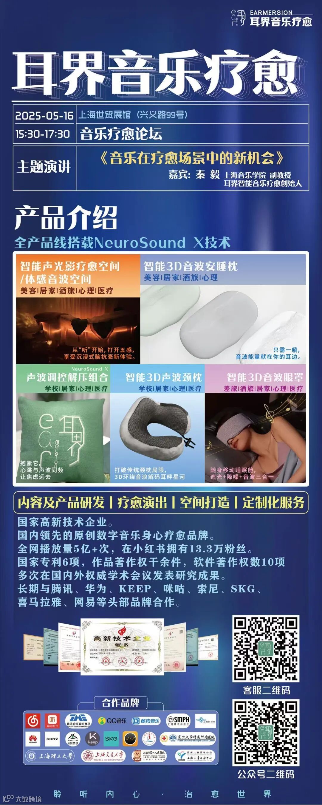 本次疗愈博览会,耳界团队也受邀来到现场,为大家带来由耳界团队研发的前沿疗愈音乐产品--包括NeuroSound X音波安睡枕、NeuroSound X声波调控解压套组、NeuroSound X音波眼罩、NeuroSound X声波颈枕