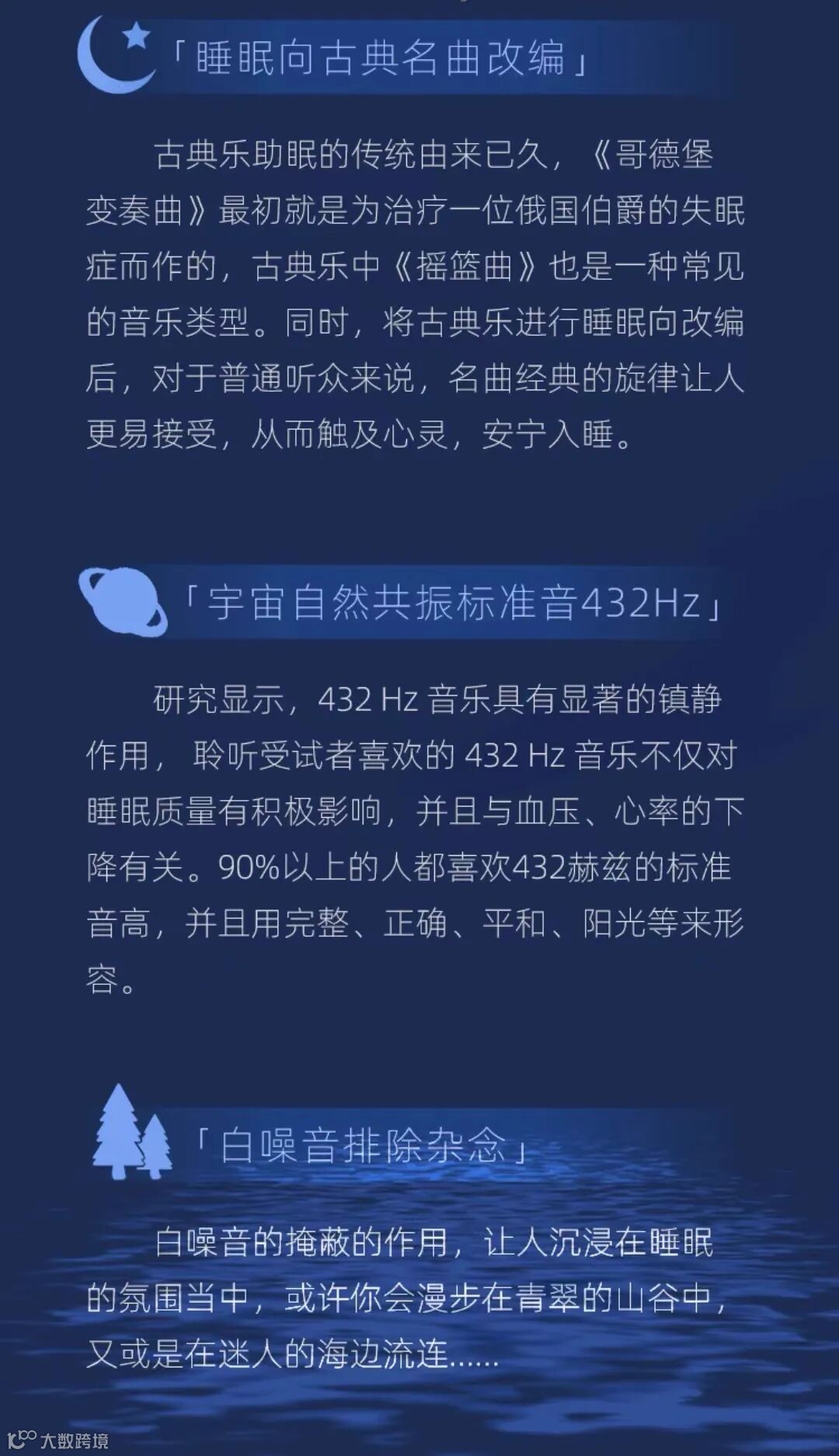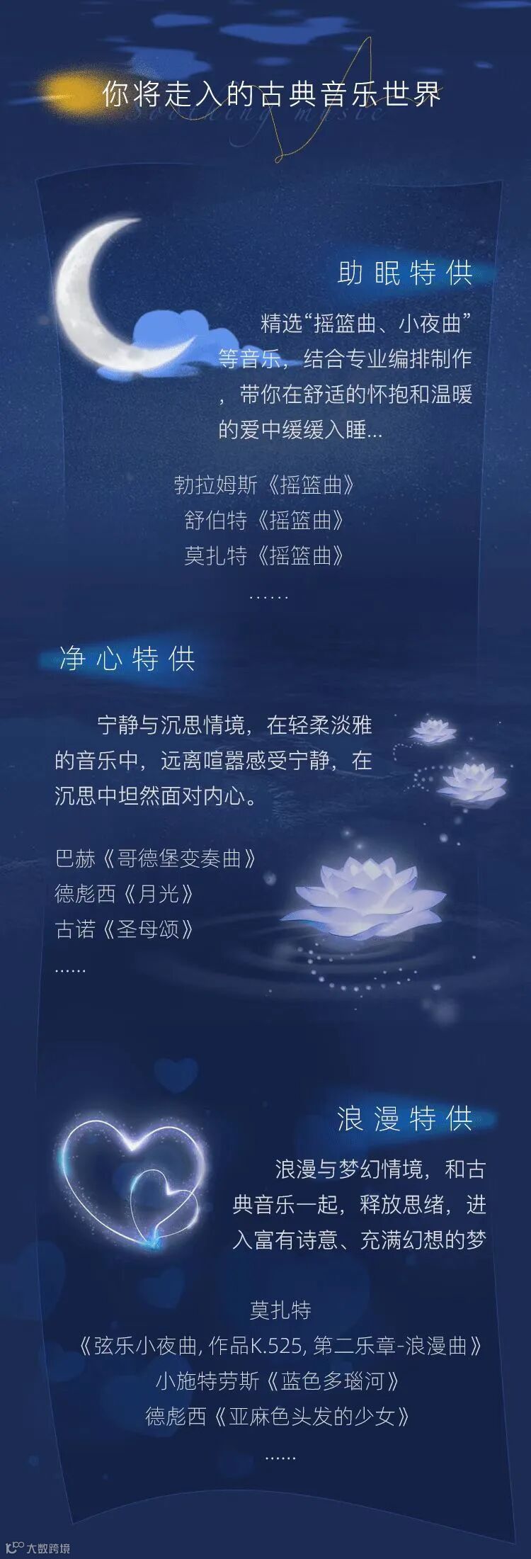 事实上,每个人都可以“睡眠自由”,相较于歌曲,古典音乐更是一张良好的“处方”。古典音乐不仅能够提升人的气质和修养,轻松、优雅的旋律更可以帮助睡眠,令人愉快而宁静,形成夜晚沉睡的完美配方。