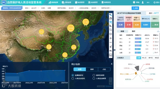 为解决自然保护地监管所面临的技术支撑“短板”,生态环境部组织研发了自然保护地人类活动监管系统。该系统采用3S技术、大数据、云计算等先进技术,建立了综合信息化、覆盖全面化、高效便捷化、协同一体化的自然保护地人类活动监管系统,支持便捷、高效、规范的自然保护地人类活动遥感监测数据下发、逐级核查填报、抽样巡查、专项督察等全过程监管链条以及人类活动信息的台账化管理维护与多维展示分析,初步实现了“统一标准、统一数据、统一系统”和“监测与监管协同、国家与地方协同、天空地协同”的三统一、多协同、全过程的自然保护地人类活动监管目标,为自然保护地人类活动监管提供有力技术支撑。