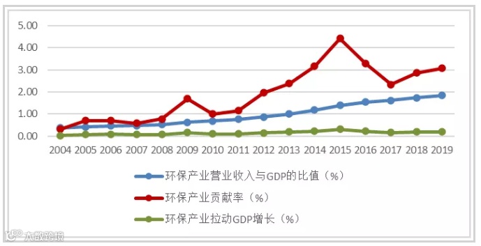 环保产业对国民经济直接贡献率从2004年的0.3%上升到2019年的3.1%,尽管期间出现过一些波动,但环保产业对国民经济的贡献总体呈逐步加大的趋势。