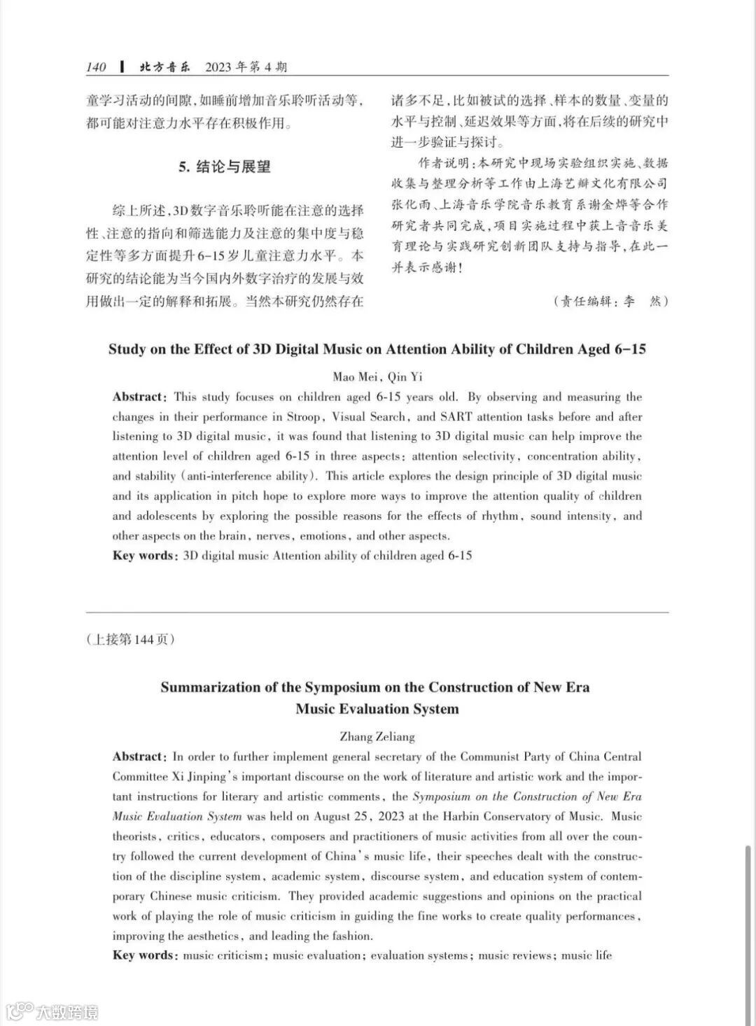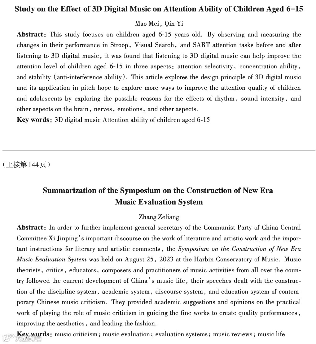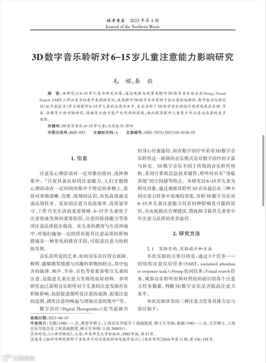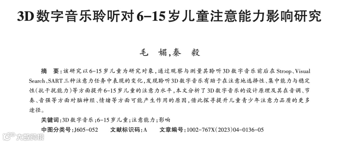 10月,上海音乐学院副教授秦毅老师和毛媚于哈尔滨艺术学院季刊《北方音乐》发表了最新论文《3D数字音乐聆听对6--15岁儿童注意能力影响研究》。