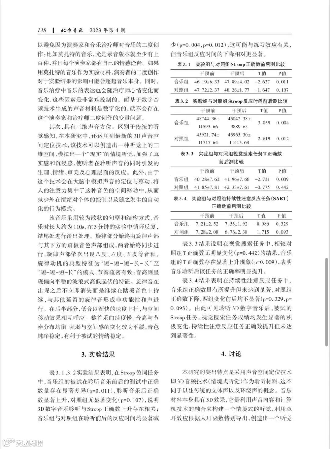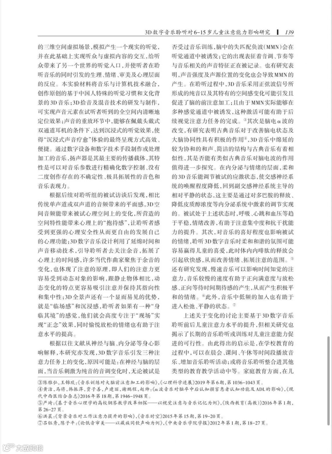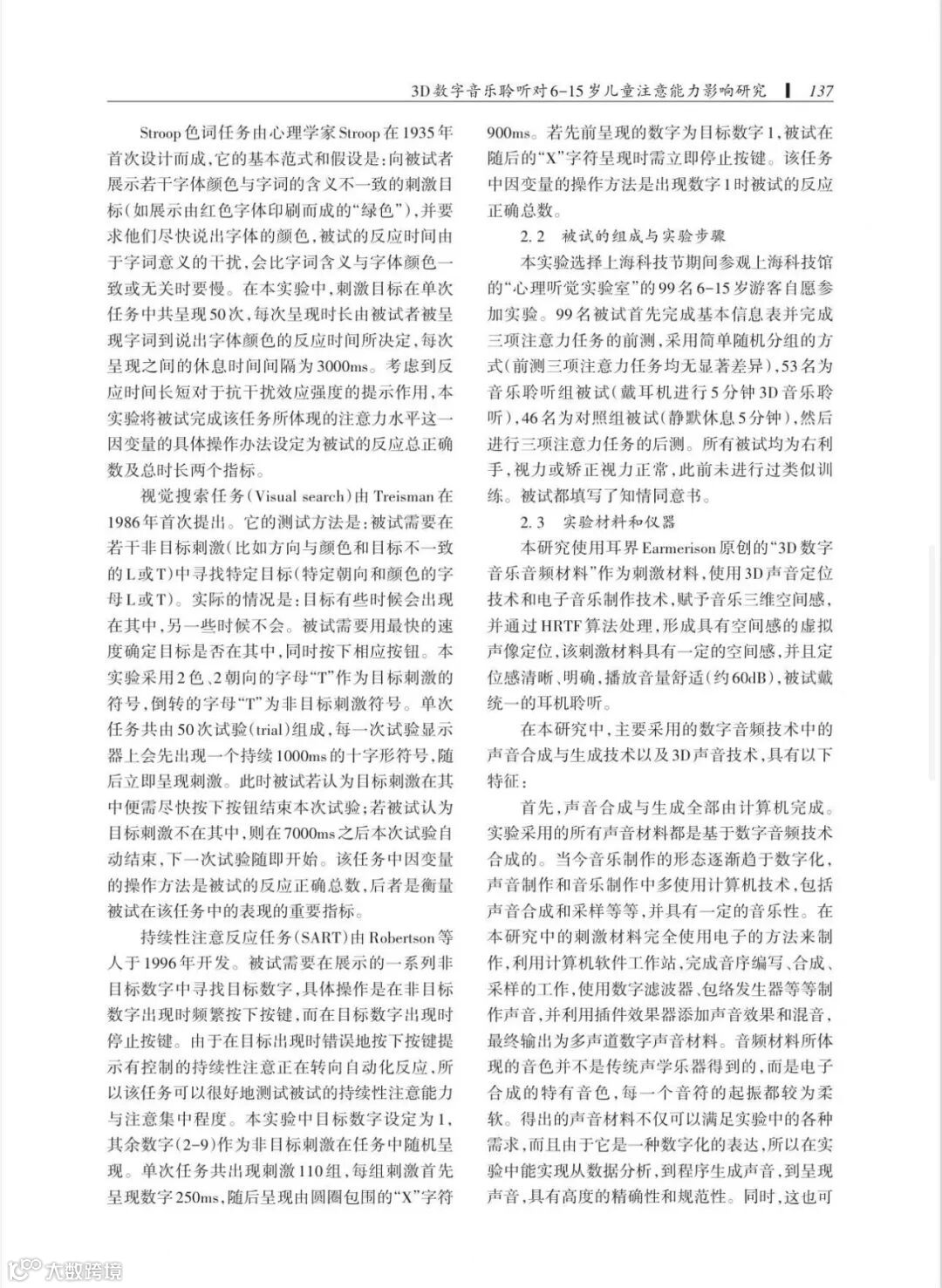 论文通过观察与测量6~15岁儿童在聆听3D数字音乐音乐前后的Stroop、Visual Search、SART三种注意力任务中表现的变化,发现聆听3D数字音乐有助于在注意的选择性、集中能力与稳定性(抗干扰能力)等方面提升6~15岁儿童的注意力水平。
