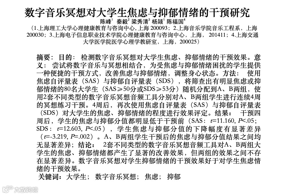 而本次研究的意义在于尝试将数字音乐与冥想相结合,为受焦虑与抑郁情绪困扰的学生提供一种便捷的干预方式,改善焦虑与抑郁情绪,调整身心状态。