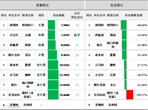 深圳河河口、西航道鸦岗、练江海门湾桥闸等7个断面水质同比有所改善,东莞运河樟村1个断面同比有所变差。
