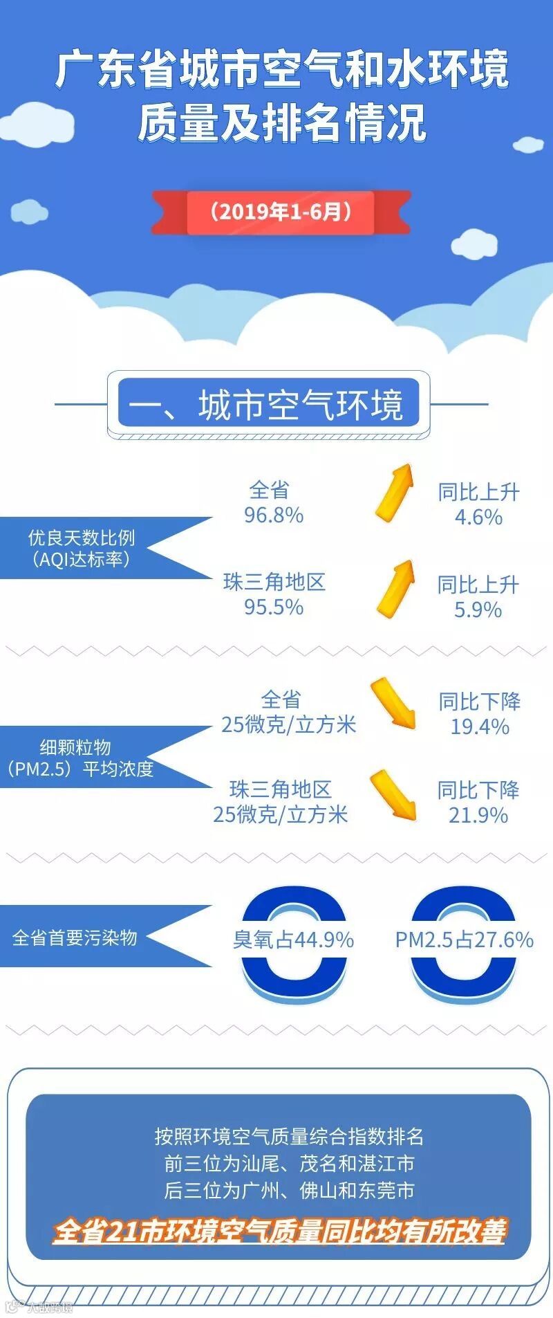 2019年1~6月,全省空气优良天数比例(AQI达标率)为96.8%,较2018年同期上升4.6%,据了解,这是实施空气环境质量新标准以来同期最好水平。而珠三角地区AQI达标率为95.5%,同比上升5.9%。