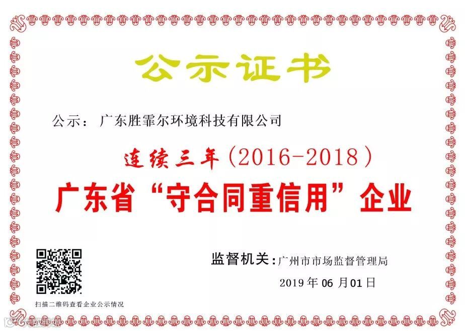 近日,广东省市场监督管理局对2018年度广东省“守合同重信用企业”进行公示,广东胜霏尔环境科技有限公司以诚信的经营以及良好的市场信誉获得“连续三年(2016-2018)广东省守合同重信用企业”荣誉称号。