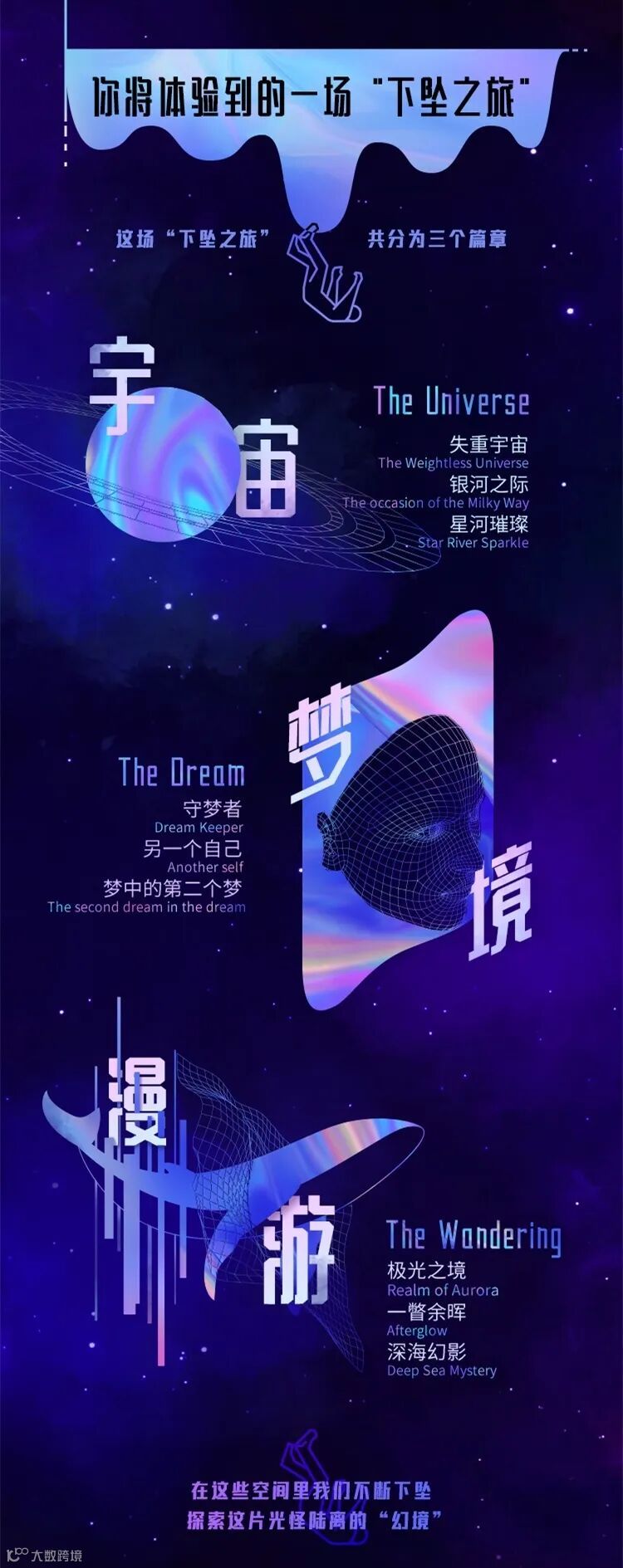三个篇章:宇宙、梦境和漫游。从不同层面利用心率牵引带领我们来到属于自己、属于世界和属于未来的空间里,在这些空间里不断下坠,探索这片光怪陆离的“幻境”。