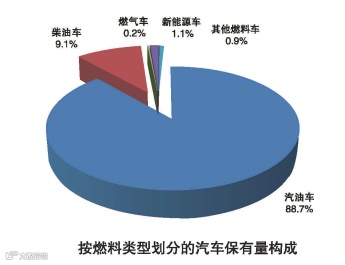 汽车已占我国机动车主导地位,其构成按车型分类,客车占88.9%,货车占11.1%;按燃料类型分类,汽油车占88.7%,柴油车占9.1%,新能源车占1.1%;按排放标准分类,国三及以上标准的车辆占92.5%。