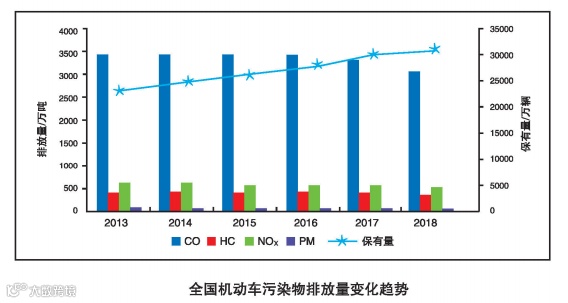 2018年, 全国机动车四项污染物排放总量初步核算为4065.3万吨。其中,一氧化碳(CO)3089.4万吨,碳氢化合物(HC)368.8万吨,氮氧化物(NOx)562.9万吨,颗粒物(PM)44.2万吨。