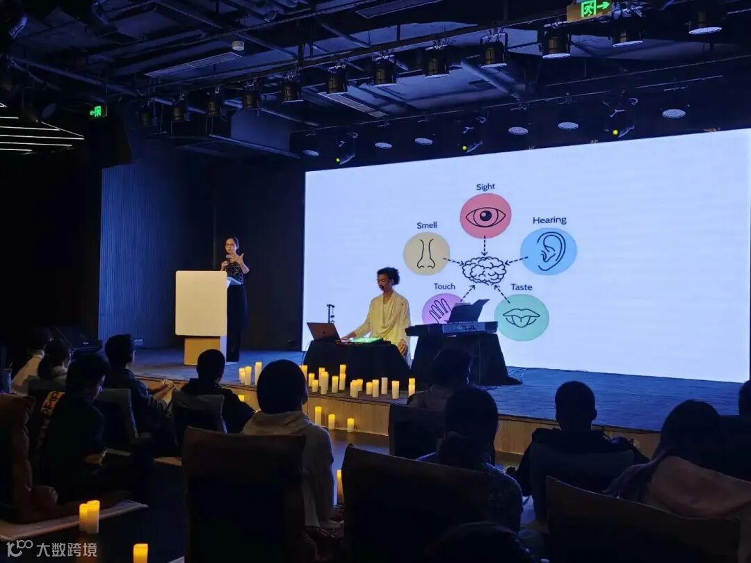 秦毅老师讲述了多重感官体验对身心的共同作用,并让同学们亲身体验了【耳界】沉浸式冥想音乐疗愈馆《生机》的音乐冥想演出。