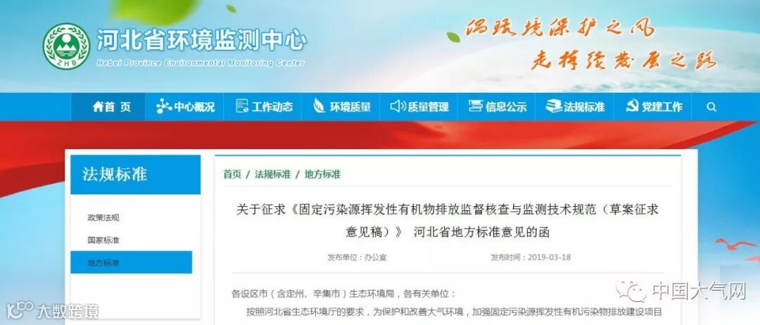 2019年3月18日,河北省环境监测中心发布“关于征求《固定污染源挥发性有机物排放监督核查与监测技术规范(草案征求意见稿)》 河北省地方标准意见的函”。
