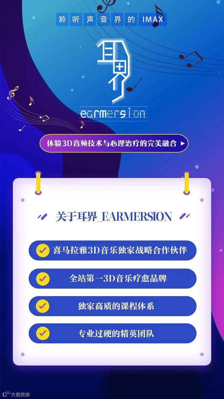 作为喜马拉雅喜马拉雅3D音乐独家战略合作伙伴、全网领先的3D音乐疗愈品牌、爆款制造机——耳界_Earmersion是国内领先的专注于沉浸式声音疗愈内容制作与技术研发的团队,团队核心成员来自上海音乐学院、上海交通大学等国内外知名院校,覆盖艺术、文化传播、音乐科技、计算机信息技术等多专业、多领域人才。拥有6项发明专利、9项软件著作权、数项著作权、商标。多篇论文发表于国内外著名学术会议、期刊等。