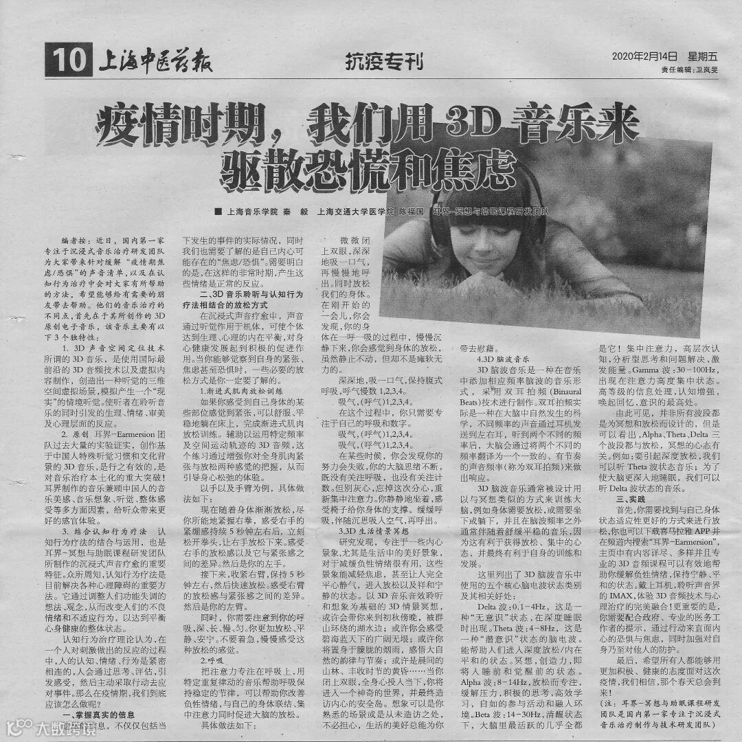 新冠肺炎疫情出现后,《上海中医报》、第一人民医院公众号、上海市教委学生心理健康大中心等以“缓解疫情期恐慌和焦虑”为主题报道耳界制作的沉浸式声音疗愈。