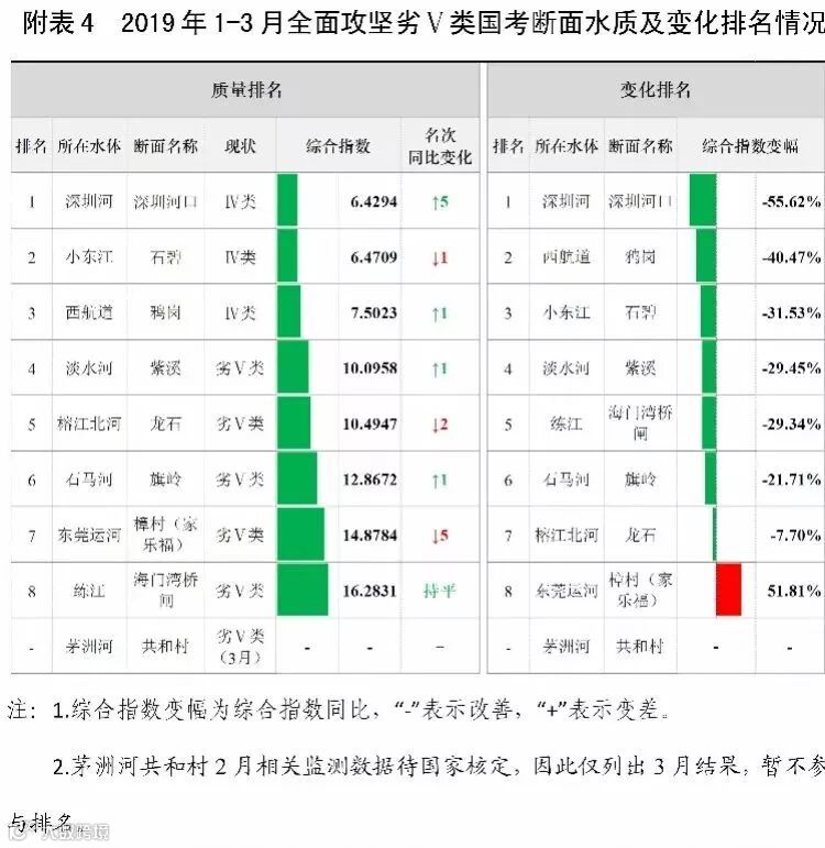 2019年1-3月,9个全面攻坚劣Ⅴ类国考断面中(茅洲河水质监测结果待生态环境部核定),水质综合指数排名前三位为深圳河口、小东江石碧、珠江西航道鸦岗,后三位为练江海门湾桥闸、东莞运河樟村、石马河旗岭。深圳河口、西航道鸦岗、小东江石碧等7个断面水质同比有所改善,东莞运河樟村(家乐福)1个断面同比有所变差。