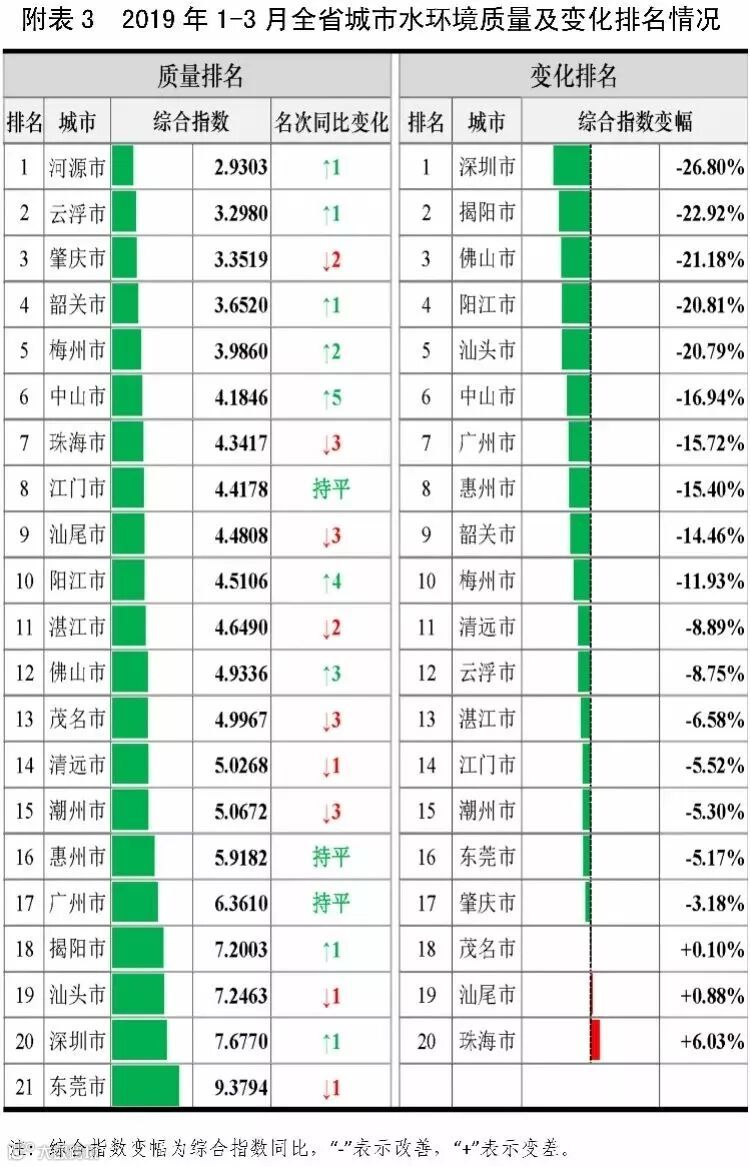 2019年1-3月,168个地表水省考断面中,水质综合指数排名前三位为河源、云浮、肇庆市,后三位为东莞、深圳、汕头市。深圳、揭阳、佛山等17市水环境质量同比有所改善(河源市省考断面水质均达到或优于Ⅱ类且达标,不参加变化排名),珠海、汕尾、茂名等3市同比有所变差。