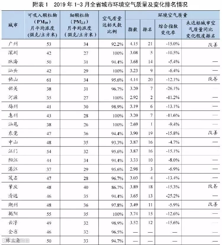 按照环境空气质量综合指数排名,前三位为汕尾、河源、湛江市,后三位为广州、佛山和东莞市;全省21市环境空气质量同比均有所改善。