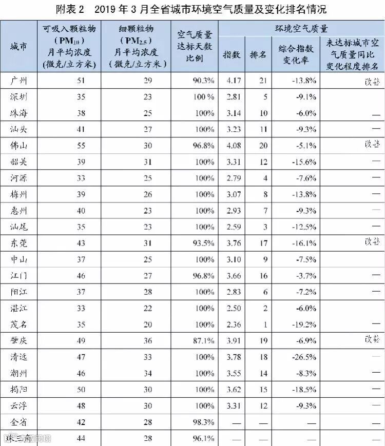 2019年3月,全省AQI达标率为98.3%,同比上升4.8个百分点;珠三角地区AQI达标率为96.1%,同比上升4.7个百分点。