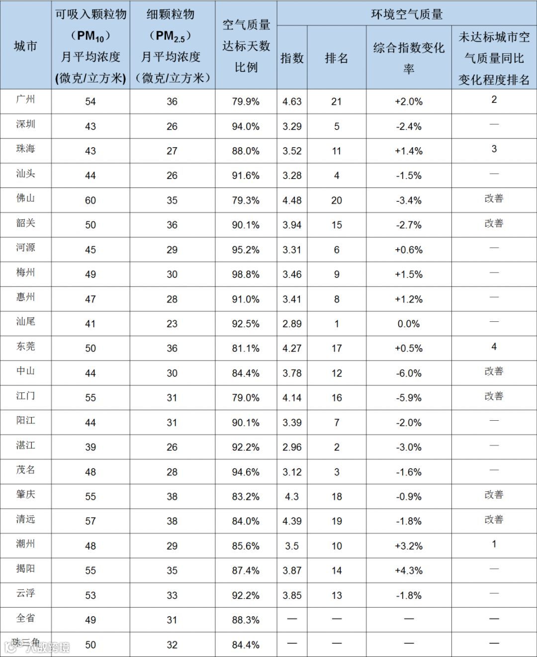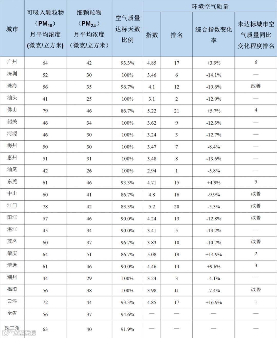 备注:1、城市各项污染物浓度在排名时段达到环境空气质量二级标准的,不参与城市空气质量变化程度排名;2、综合指数变化率单位为百分比,“+”表示空气质量变差,“-”表示空气质量改善。