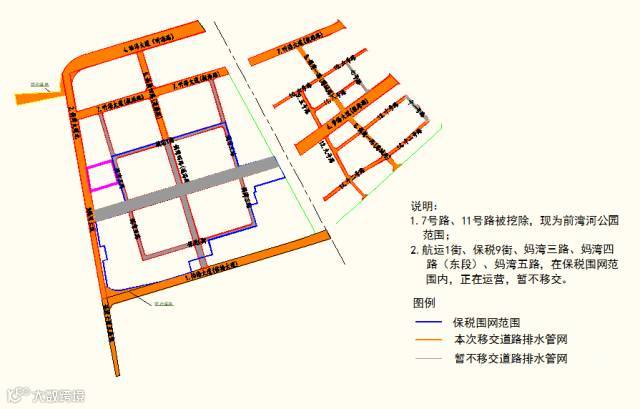本次移交的妈湾片区十四条市政道路排水管网包括:雨水管约20102米,雨水箱涵约793.5米,水管约15660.5米,雨水检查井及雨水口约为1347个,污水检查井约为592个。