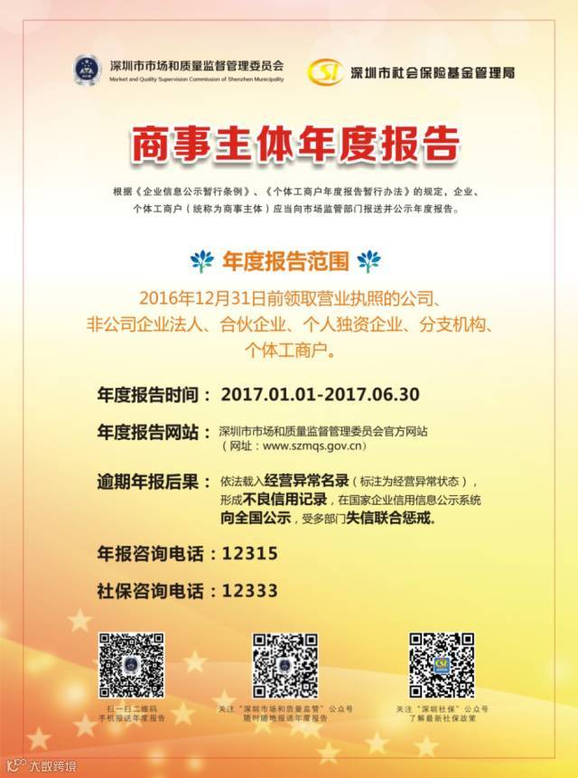 三、申报年报方式:登录网址:www.szmqs.gov.cn或www.szcredit.org.cn自行申报;也可手机扫二维码等方式报送;
