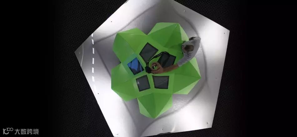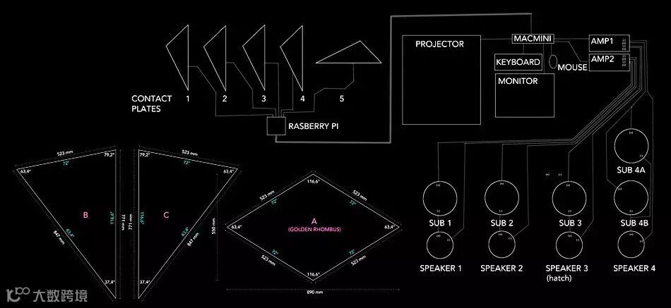 在装置上方的菱形玻璃以及天花板上的五面反射镜中