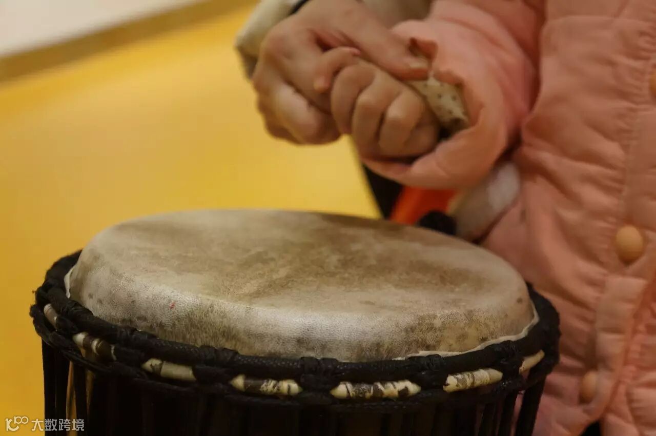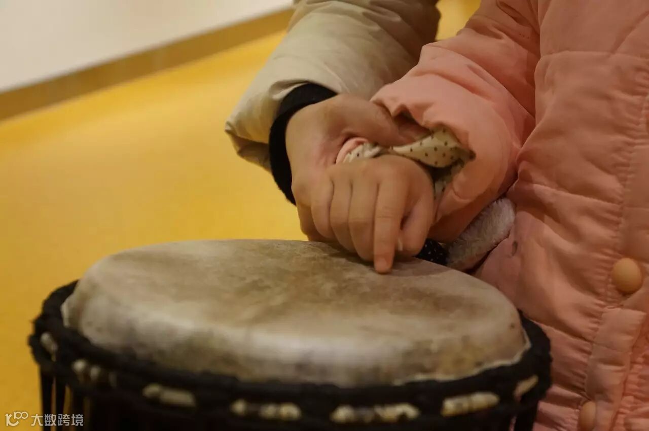 鼓的热情让我们的小宝贝有一些些害羞,可是有妈妈的陪伴,一切都会安心,在妈妈的陪伴下,小宝贝慢慢尝试着自己拍打鼓面,组合自己喜欢的节奏。