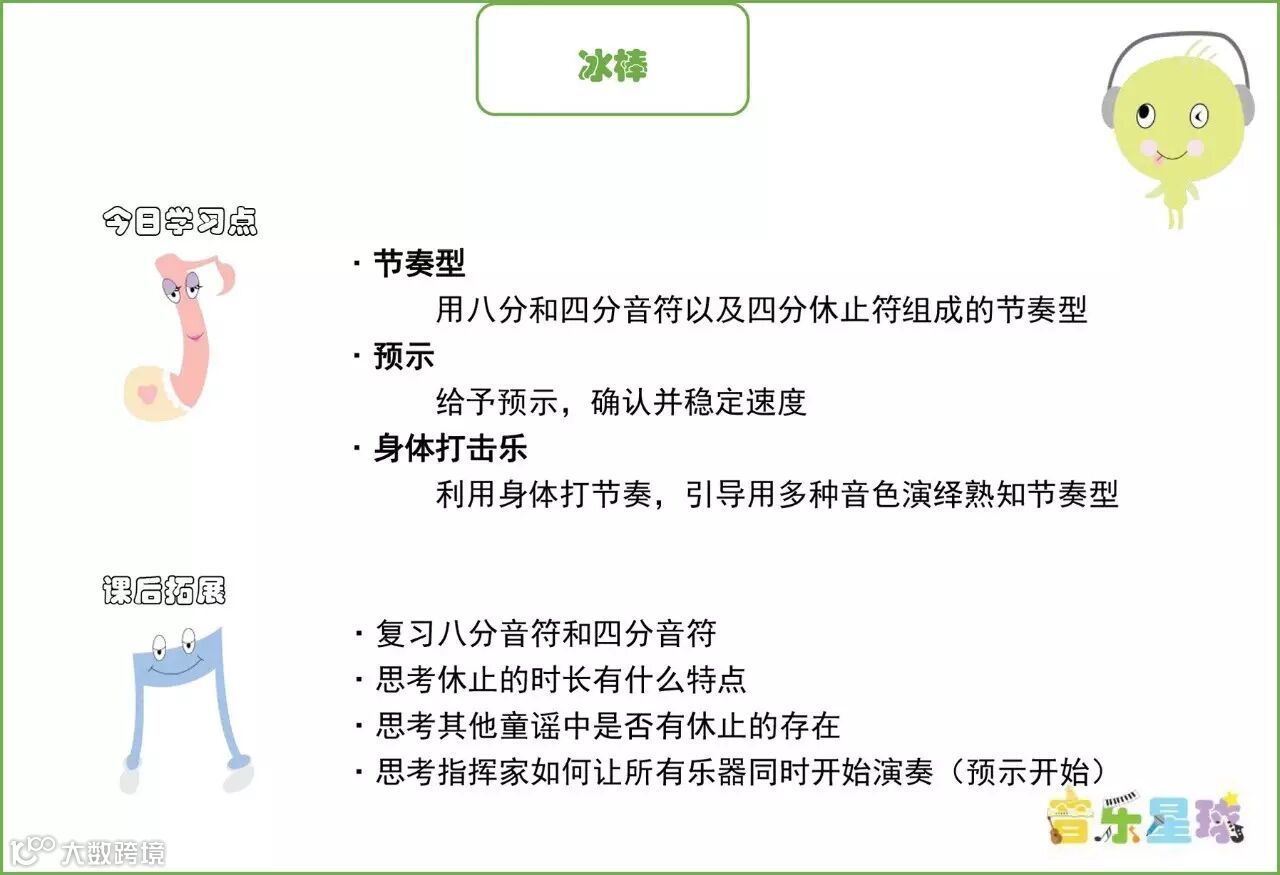 游戏规则:老师发给每个小朋友不同节奏型的棒冰小卡牌,小朋友们可以自由组合,通过拍打身体不同部位,展示出自己的节奏棒冰。