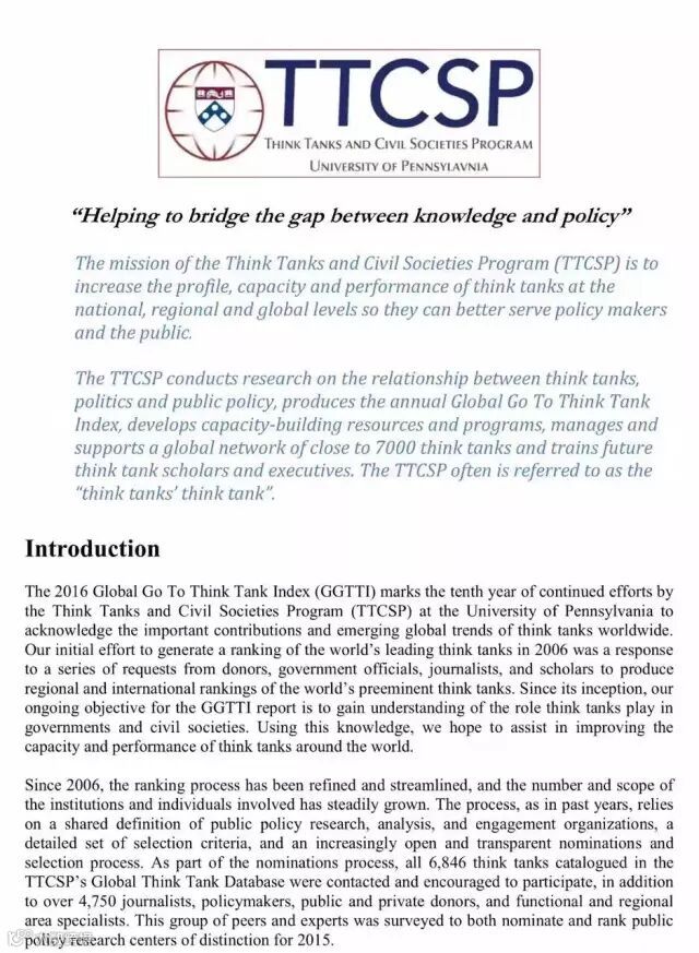 根据区域分布、研究领域、特殊成就三类标准,宾夕法尼亚大学智库研究项目(TTCSP)研究编写的《全球智库报告2016》共列出52个分项表单。其中,中国智库上榜的表单数量达到41个,与2015年相比增加了13个,反映出中国智库发展呈现的良性态势。2015年,中办国办就加强中国智库建设发出重要文件、提出明确要求。在中国政府重视智库建设的背景下,中国智库迎来了发展的春天。其中:
