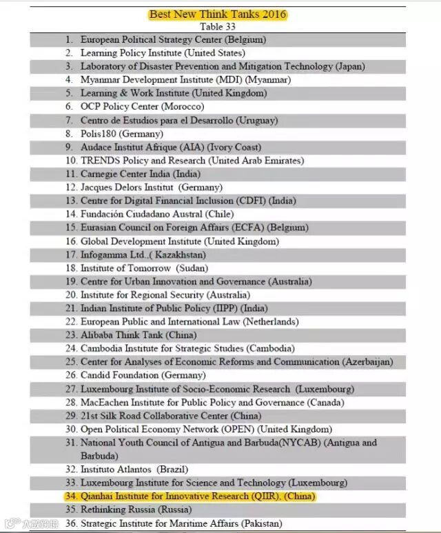 上月,由美国宾夕法尼亚大学“智库与公民社会项目”(TTCSP)编写的全球最具影响力的智库报告《全球智库报告2016》在北京正式发布,今年正是此项目权威报告发布的第十年,前海创新研究院(QIIR)入选“2016年度最佳新锐智库”,位列第34名,在该榜单中,仅有四家中国智库机构上榜。