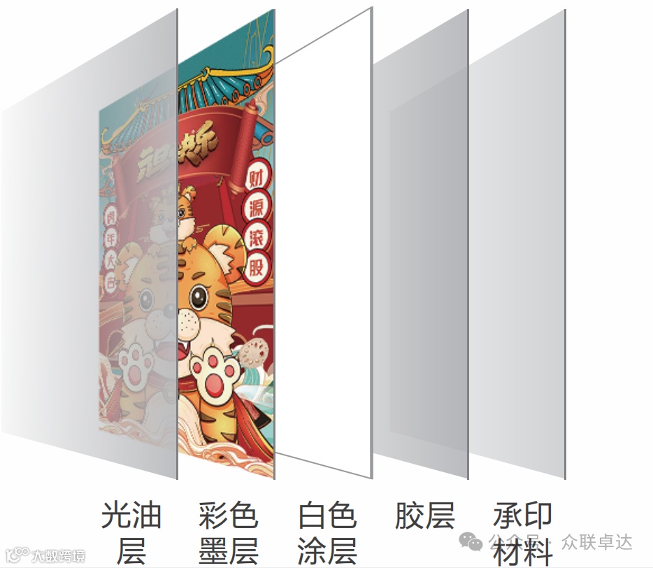 UV水晶标打印覆膜一体机,就是采用的AB膜工艺,先将白、彩、光油同步打印在带胶水的A膜上,再覆盖B膜转移即可。