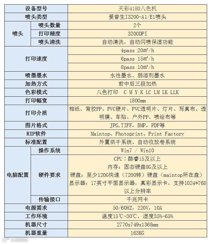 采用爱普生I3200-A1双喷头配置,一个喷头打印深色墨水,一个喷头打印浅色墨水,打印时速4pass 20㎡/h,高品质色彩输出。