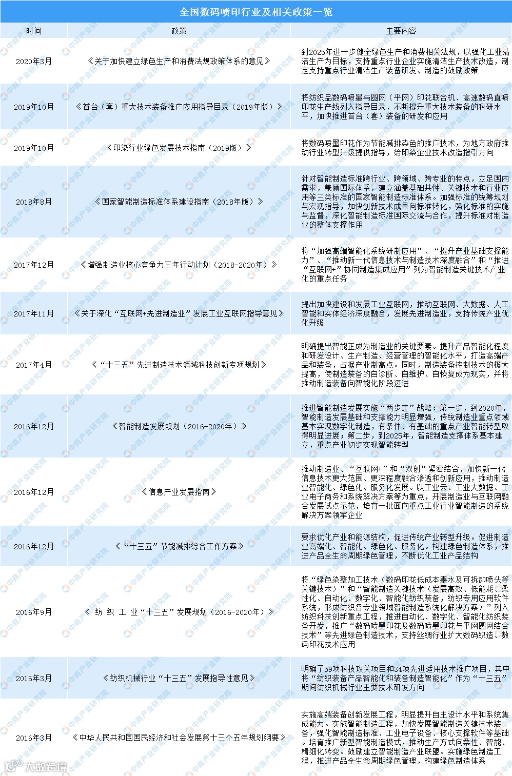 数码喷印技术是一种先进且发展迅速的印花技术和大幅面印刷技术,目前广泛应用于纺织品印花、地毯制造、广告制作等行业,其中,纺织印花行业由于其面料品类的丰富性、对颜色精准度以及大幅面印制准确度的高要求,成为技术应用攻坚的“至高点”。近年来,国务院、国家发改委、科技部等有关部门陆续出台了一系列鼓励和扶持产业发展的政策性文件,极大地促进和规范了行业的健康发展。