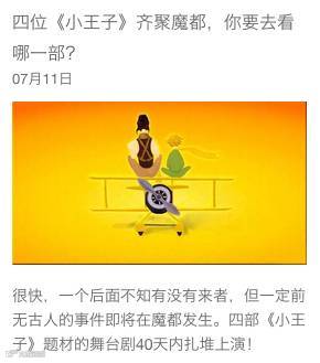 出品方理想文化表示,相信这四部舞台剧都是精心之作,档期接近但也不完全重合,协力促成市场热点,让更多观众走进剧场,无疑是一件好事。《我,小王子》主创们也会以最大诚意,尽最大努力完成好自己的工作,不负众望。