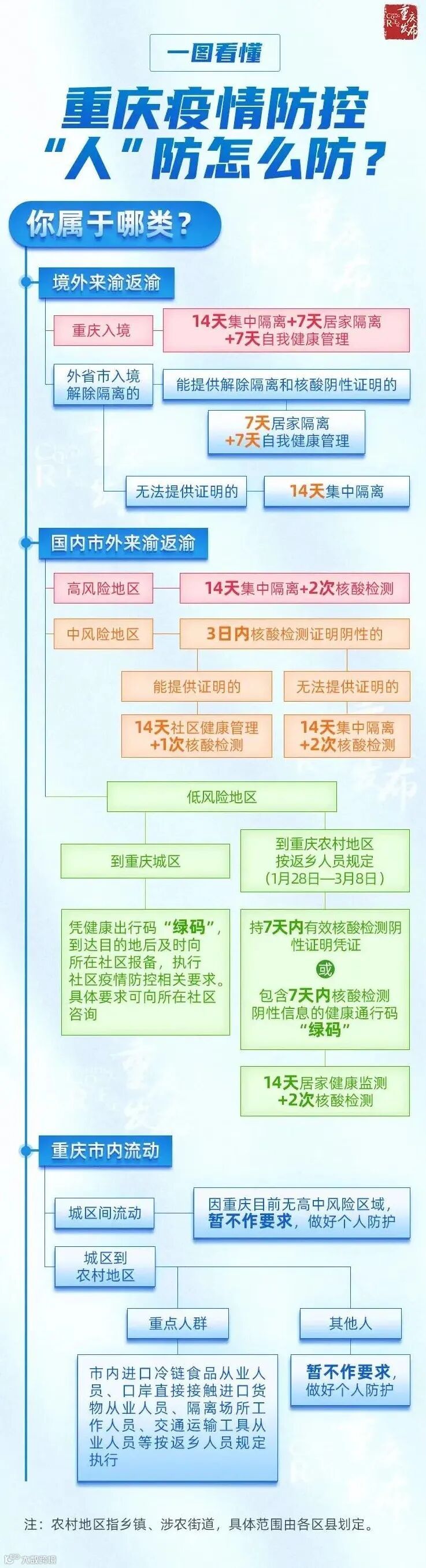 对有中高风险地区旅居史的入(返)川人员严格实施14天集中隔离医学观察和至少2次核酸检测;有中高风险地区所在设区市(直辖市为区)旅居史人员入(返)川,需持有7日内核酸检测阴性证明,无法提供的,立即在首站地实行全闭环核酸检测,核酸检测阴性后方可自由流动。