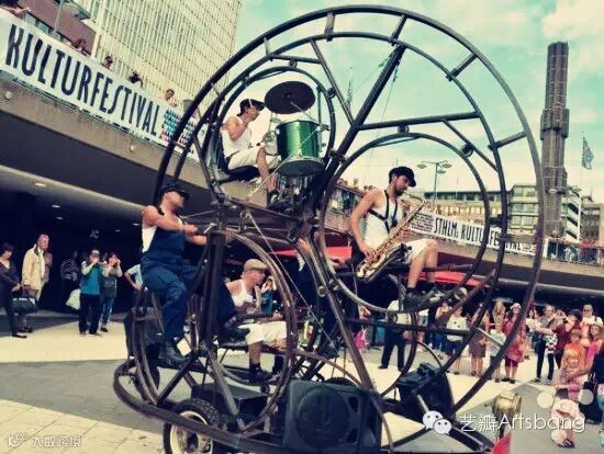 这个大转轮是巴塞罗那Factoria Circular乐队的演奏道具。是由巴西著名设计师、音乐家拜耳(César Alvarez Bayer)设计出的史上最怪异的舞台Rodafonio,并在巴西街头戏剧节上展出。