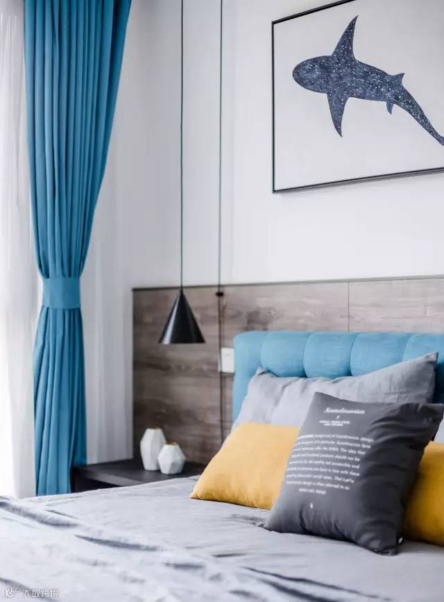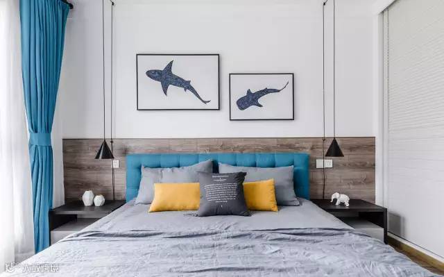 两边对称装饰吊灯,床头背景用蓝鲸鱼画做装饰。