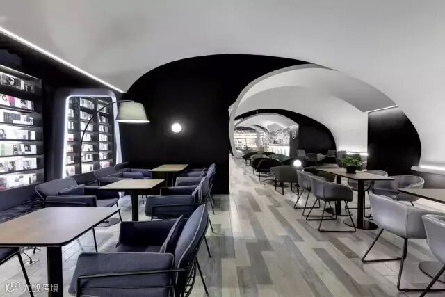 这里的深色调与纯白色的空间产生强烈的对比,