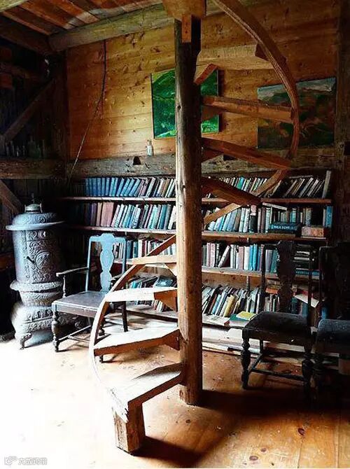 木质的旋转楼梯以及木质的书架和地板都让整个空间充满淡淡的宁静感。加上墙面上满满的书籍让整个身心都瞬间沉静下来。旋转楼梯下方的空间可以设计成各种各样的,不必拘泥于书房这样的设计。