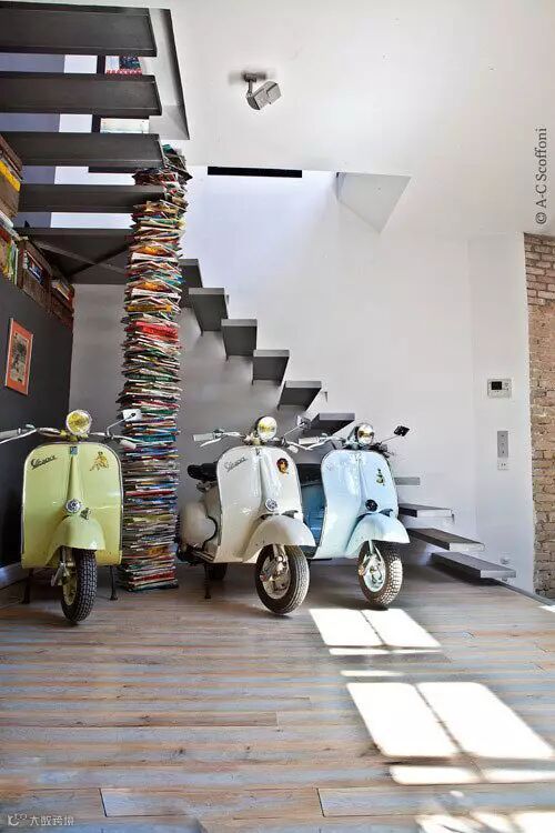 一级一级自成一体的台阶拼凑成了充满创意的楼梯。扶摇直上很有腾云驾雾的感觉,下方空间中高高垒砌的书本估计也花费了主人不少心思。如此个性的设计当中摩托车停放车似乎也不错啊!
