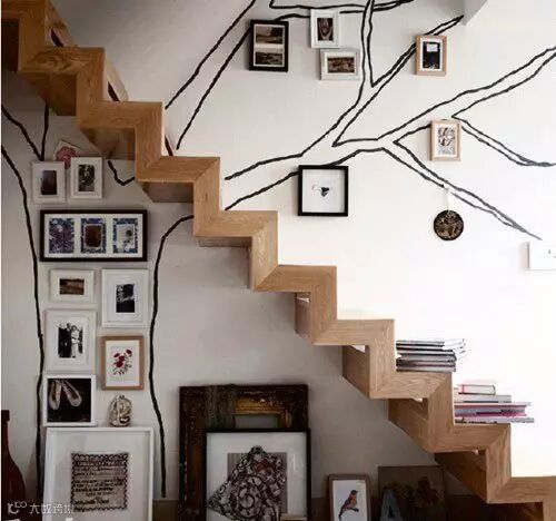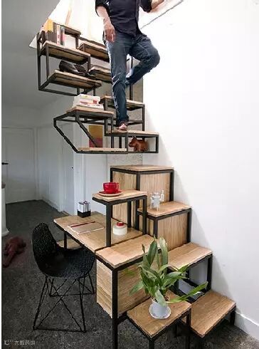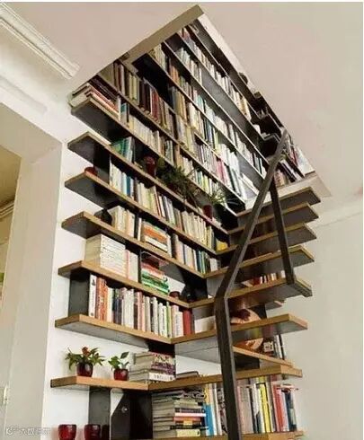 又是一款将书架和楼梯融为一体的设计,对于小户型来说,可以充分利用墙面做书籍收纳,这里书籍的每一层隔板都与台阶相连,打造了一处别致的上下楼梯造型,空间虽小,但是很温馨,有没有很心动呢?