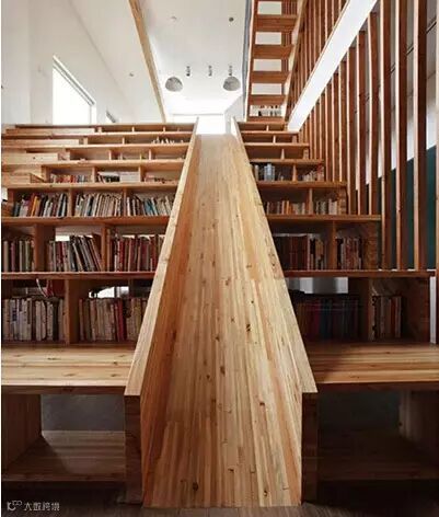 将楼梯与书架设计在一起是不是很有创意呢,书架不仅可以当台阶使用,还可以坐在这休闲阅读,别出心裁的滑梯设计,不仅孩子们喜欢,大人看到也会联想到自己曾经的孩童时代,实木的书架和楼梯还略带质朴风味。
