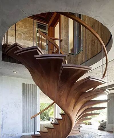 螺旋状的实木楼梯设计,每一层台阶就像粗壮的树干分叉了一样,带着浓浓的质朴自然气息。