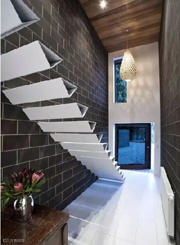 悬空的楼梯设计,每层台阶之间都相互独立,看上去好像有点不稳固,不过每一层都是三角形结构台阶可稳固了,白色的台阶看上去整洁又舒适。