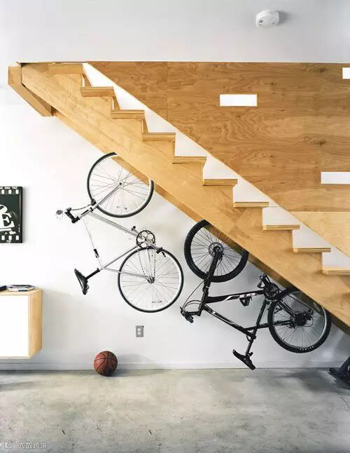 楼梯下方的空间如此设计,想不出彩都不行啊!空间足够大,当做放置体育用品的地方也不无不可。除了能像上图一样如此别出心裁的将自行车倒挂外,简单点的放上些羽毛球拍之类的东西也挺好。
