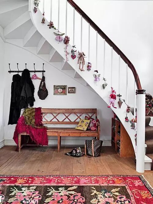 像这样比较大的楼梯空间就可以随心所欲的进行设计了,无论是小小的休息区还是设计成一个收纳地都挺不错。墙上挂着的衣帽钩也很实用。
