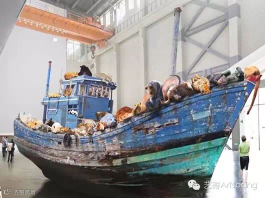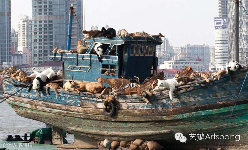 但今天,环境问题很严峻,艺术界却都在陶醉那些商业性的东西,所以既然回来这边,他就想针对生态问题做一些,至今很多人都写到《九级浪》和黄浦江的“死猪”事件,新华社记者也写出来,那天在岸边美国的记者也问他,这个跟死猪也有关系嘛?大家都看出来了,这个问题就比较敏感。其实船上面有很多动物,奄奄一息,但没有猪,蔡国强有时候不愿意那么直接,有些东西是在这个时代的怀念。