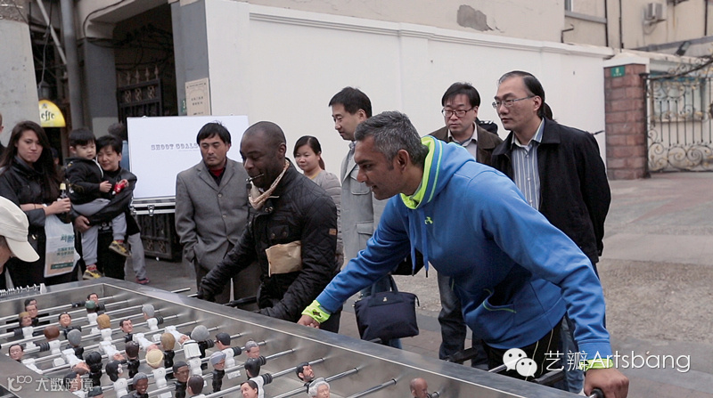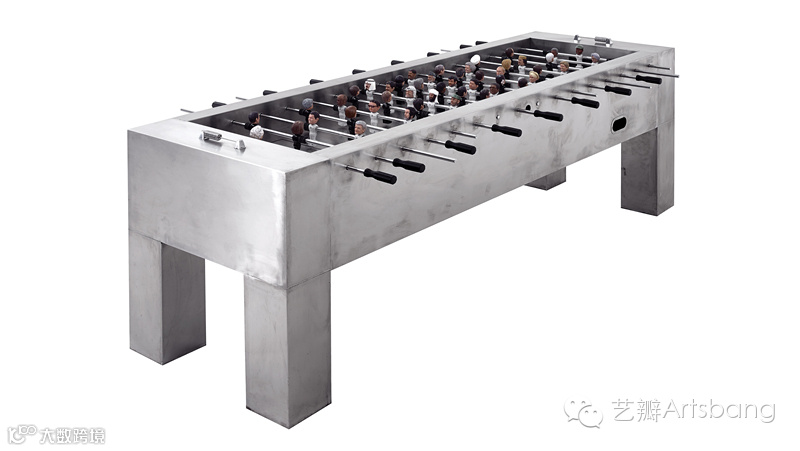 在这张长达3米的桌面足球桌上,创作者别出心裁地将46个世界风云政治家的头像雕塑安装其中, 并允许参与者选择不同的人物来组建自己的“政治家”球队。