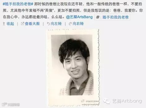 微博活动#随手拍我的老爸#不仅引爆了晒童年照片的热潮,更有不少活动参与者翻箱倒柜整理出老爸年轻时,英俊的照片。