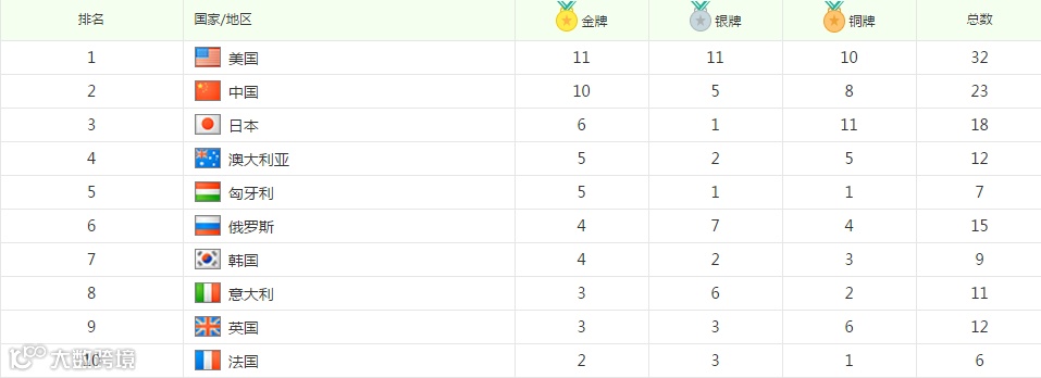 奥运金牌榜(截至北京时间 2016-08-11 11:18:09)