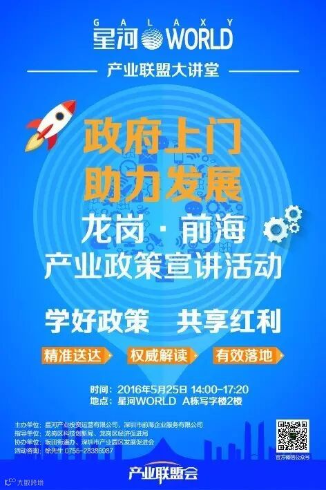 诚挚邀请您参加深圳市前海企业服务有限公司和星河产业投资运营公司共同主办的龙岗前海产业政策宣讲活动,活动将于5月25日下午在星河WORLD园区A栋写字楼2楼举办。